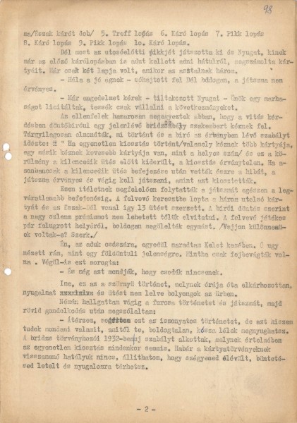 – Egy vesztés. Az adu ászt ki kell adnom – mondotta a felvevő, kinek semmi kedve sem volt végigjátszani a partit. El akarta dobni a kártyát és fel akarta írni a bukást az ellenfeleknek.