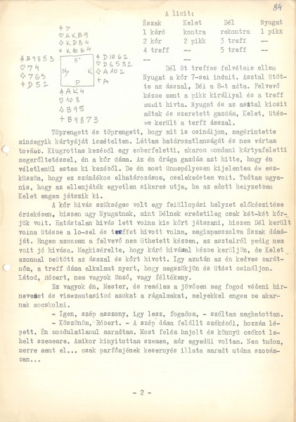 Töprengett és töprengett, hogy mit is csináljon, megérintette mindegyik kártyáját ismételten. Láttam határozatlanságát és nem vártam tovább. Kiugrottam kezéből egy emberfeletti, akarom mondani kártyafeletti megerőltetéssel, én a kőr dáma. Az én drága gazdám azt hitte, hogy én véletlenül estem ki kezéből. De én most ünnepélyesen kijelentem és esküszöm, hogy ez szándékos elhatározásom, cselekedetem volt. Tudtam ugyanis, hogy az ellenjáték egyetlen sikeres útja, ha az adott helyzetben Kelet engem játszik ki.